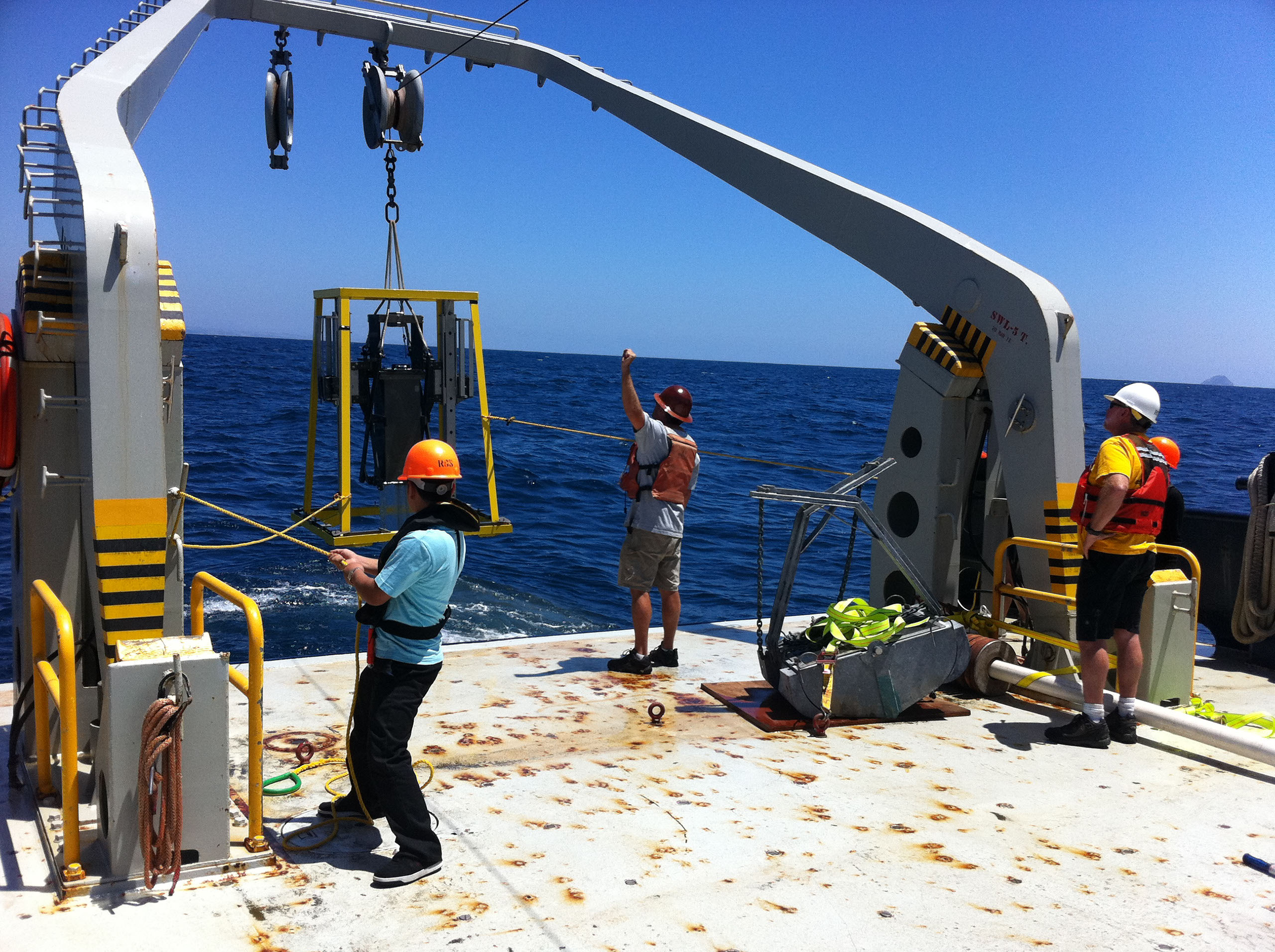 We use geophysical tools to study geology underwater. These tools include swath bathymetry, sidescan sonar, and sub-bottom seismic methods and they can be towed from small boats and larger research vessels. The swath bathymetry and sidescan sonar map the sea floor morphology and roughness, while the sub-bottom seismic data image the sediment and rock layers beneath the seafloor. We also collect sediment cores to groundtruth the geophysical data, obtain ages of sediment layers, and to measure sediment properties such as grain size.